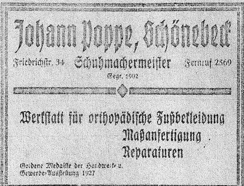 "Das Speditionsgeschäft der Firma Wilhelm Stitterich, Inhaber Kurt Volk, Steinstraße 54, übernimmt Möbeltransporte nach und von allen Richtungen mit Bahn oder Fuhrwerk. Elegante Landauer zu allen Gelegenheiten, Kremser und Lastfuhrwerke stehen zur Verfügung. Die Firma übernimmt auch Verpackung von Glas und Porzellan, sowie die Aufbewahrung von Möbel und Gütern aller Art. Seit langen Jahren Spediteur der Königlich Preußischen Staatsbahn genießt die Firma allseitiges Vertrauen."
